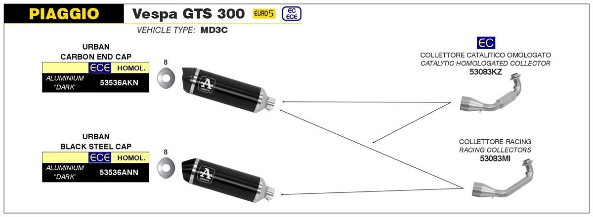 Arrow Racing collector for Urban Exhaust no street legal for Piaggio Vespa GTS 300 21-24