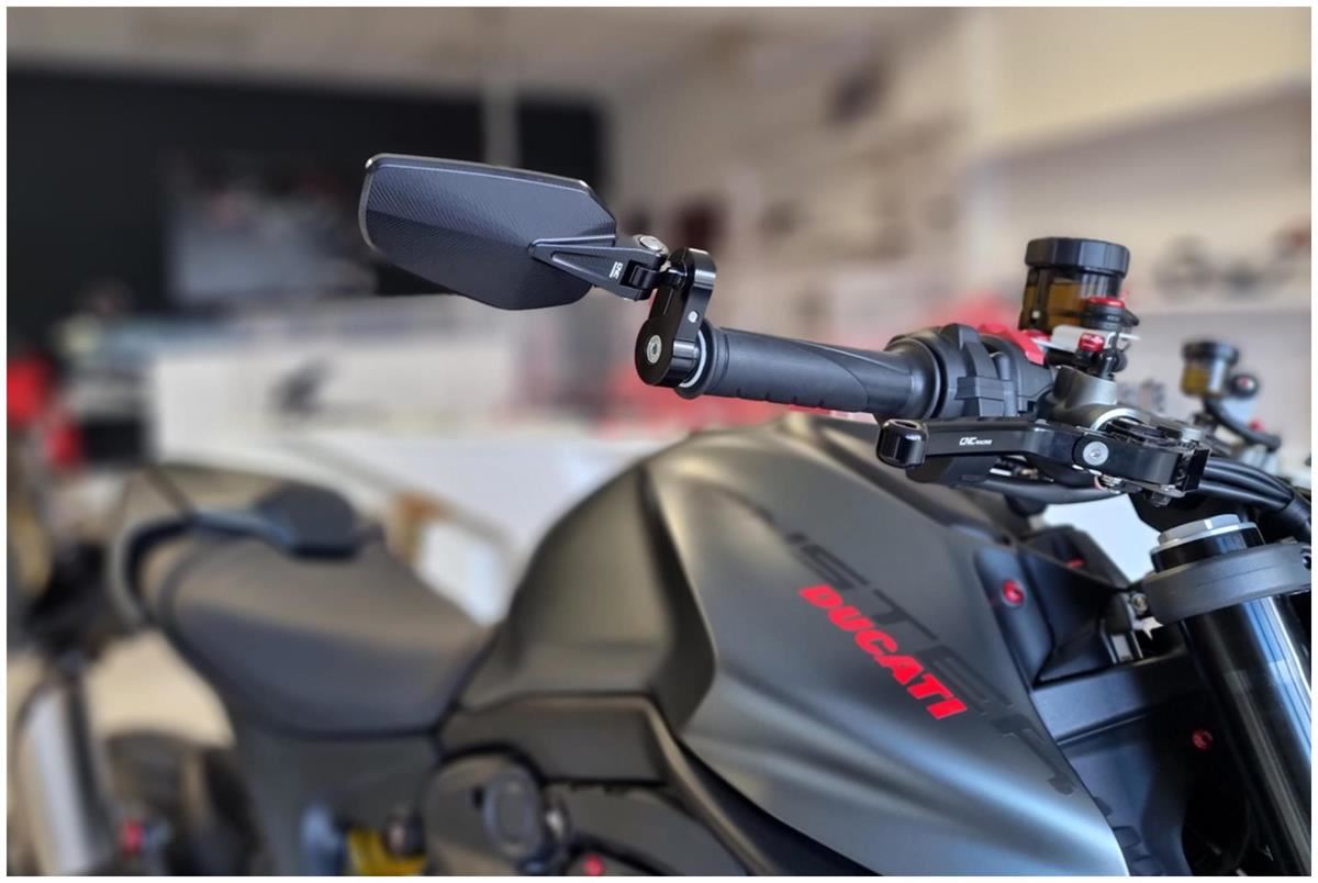 Bar-end mirror made of light alloy, machined from solid and then anodized. UNIVERSAL PRODUCT: check the possibility of correct assembly in a specialized workshop before buying.