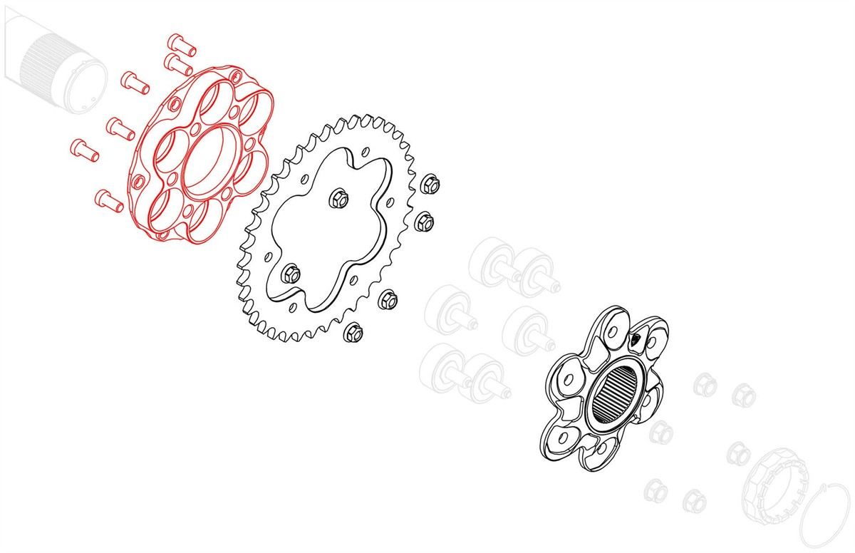 Cush drive hub flange CNC machined from light alloy billet and then given a coloured anodized surface finish. Installation screws are supplied. The Cush drive hub flange is not a replacement of the oem but can be applied only on our REAR SPROCKET KIT; it consists of: