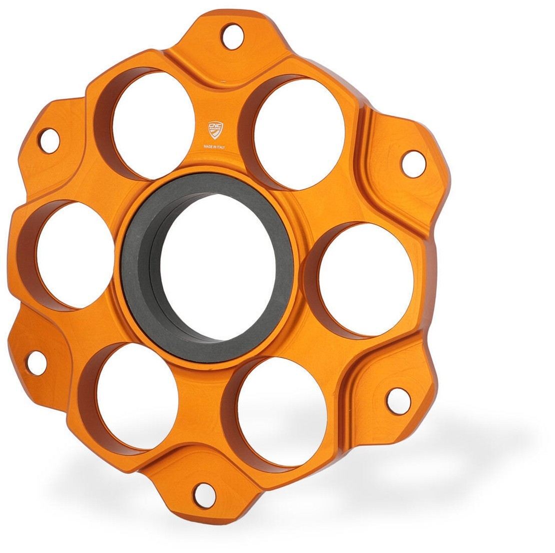 Cush drive hub flange made in light alloy and machined from solid with following surface anodizing.