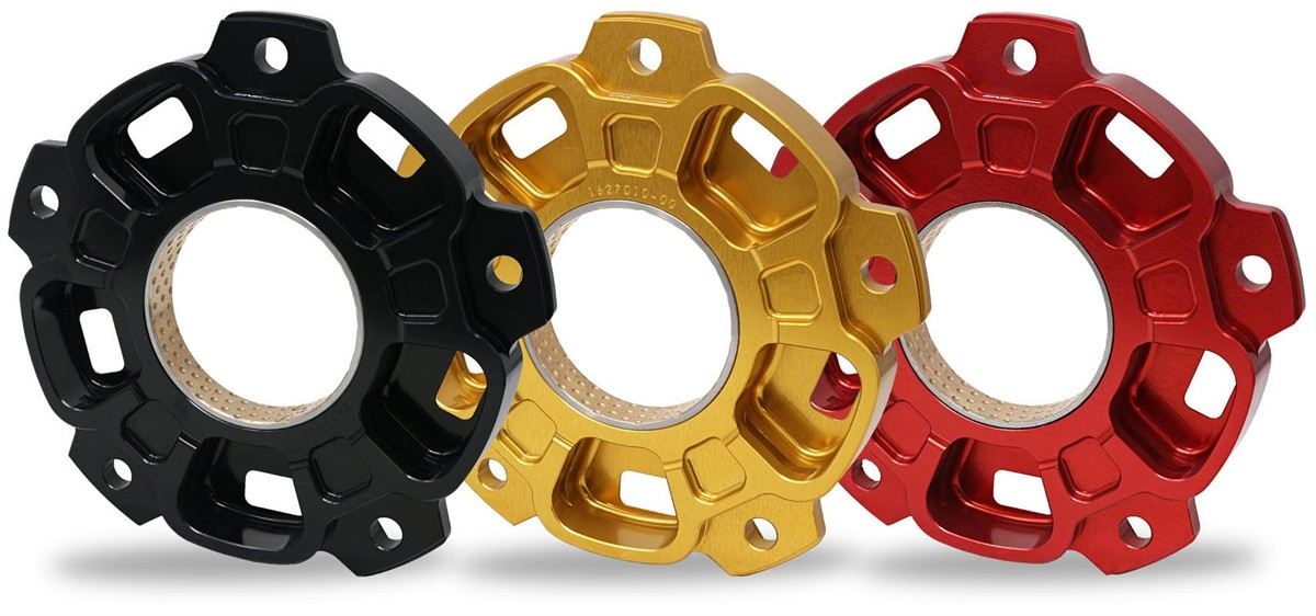 Cush drive hub flange made in light alloy and machined from solid with following surface anodizing.