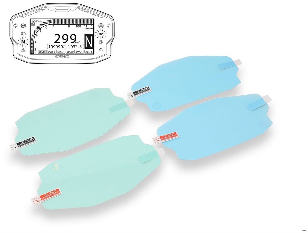 Instrument protection film kit consisting of: 2 anti-scratch films protecting from scratches and dust 2 anti-scratch and anti-glare films protecting from scratches and reducing harmful glare for good data display 1 product application kit for easy DIY fitting Detailed assembly instructions