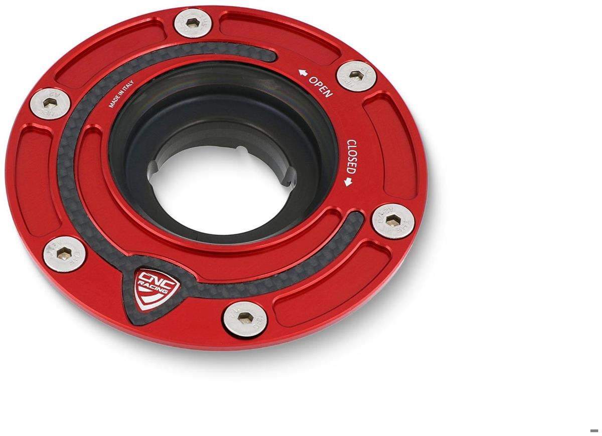 Fuel tank cap CNC machined from light alloy billet and then given a colored anodized surface finish. Notable for its exclusive race-style design, Ergal and carbon weave together to create a unique and top quality product.