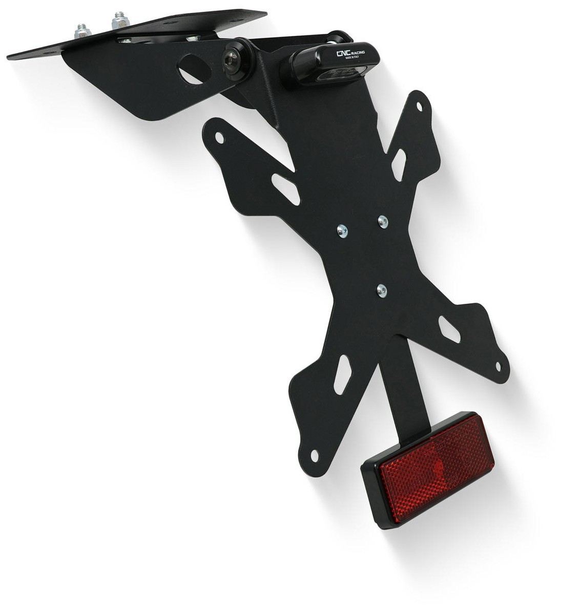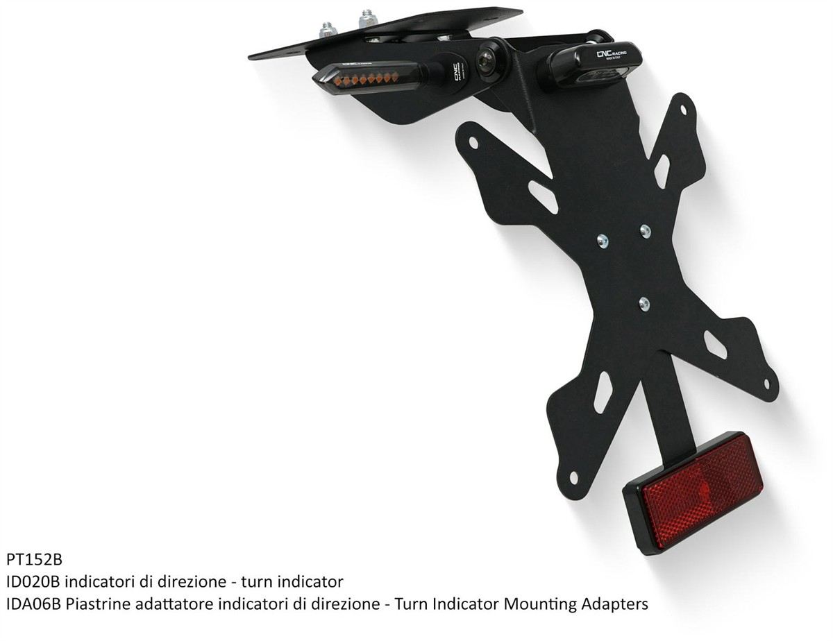 Plate holder adjustable steel including a support plate, license plate light LED, supports arrows reflector. Into the kit is included the Italian plate PTX01B; specify in the order if you prefer another size from those available.