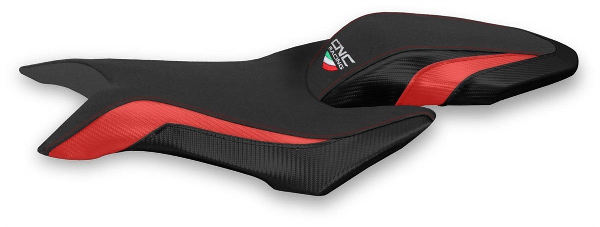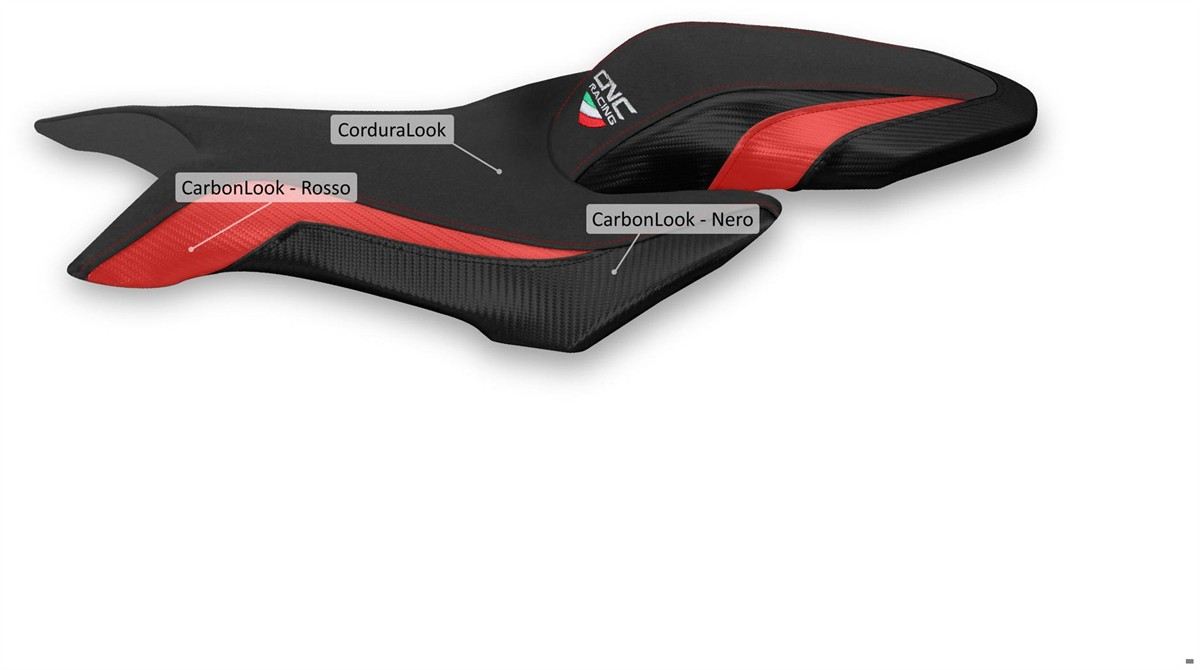 Seat cover made of non-slip black Eco-Leather CorduraLook and side layers in black and red Eco-Leather CarbonLook with reinforced double pointed stitching.