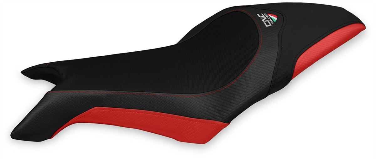 Seat cover made of non-slip black Eco-Leather CorduraLook and side layers in black and red Eco-Leather CarbonLook with reinforced double pointed stitching.