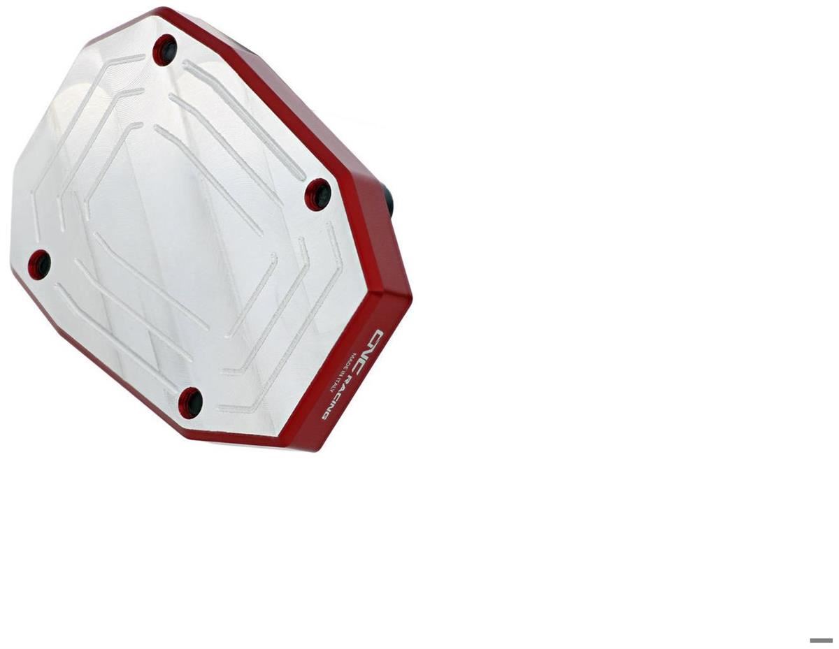 Side stand extension machined from light alloy billet and then given an anodized surface finish. Designed to provide the original kickstand with a larger surface to sit on for safer bike parking.