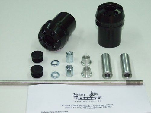 Six stainless steel springs support the visco-elastic impact absorber. in case of a crash the X-PAD compresses perfecty in a progressive way, absorbes the high impact energy and transformes it into a softer impact (see diagram). The patented Metisse X-PAD is the only slider that can offer this attributes. Individual bracket kits allow fitting without fairing modifications.