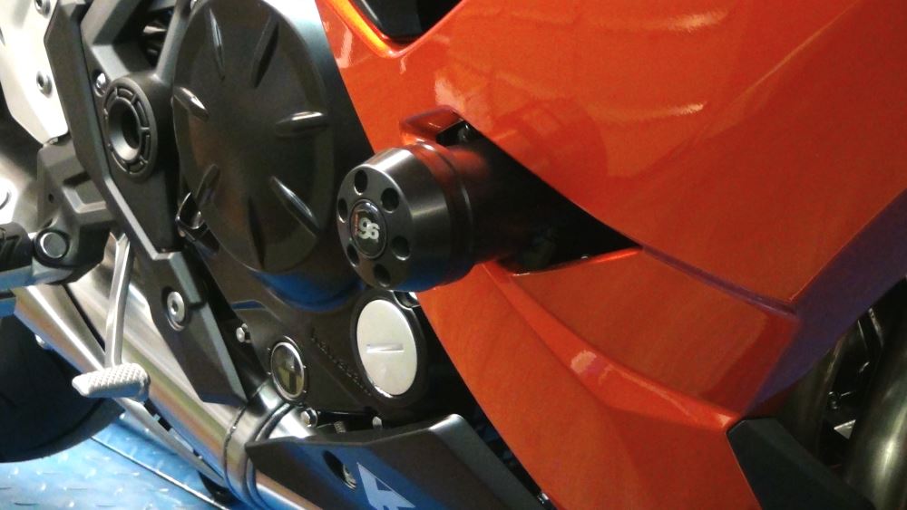 Six stainless steel springs support the visco-elastic impact absorber. in case of a crash the X-PAD compresses perfecty in a progressive way, absorbes the high impact energy and transformes it into a softer impact (see diagram). The patented Metisse X-PAD is the only slider that can offer this attributes. Individual bracket kits allow fitting without fairing modifications.