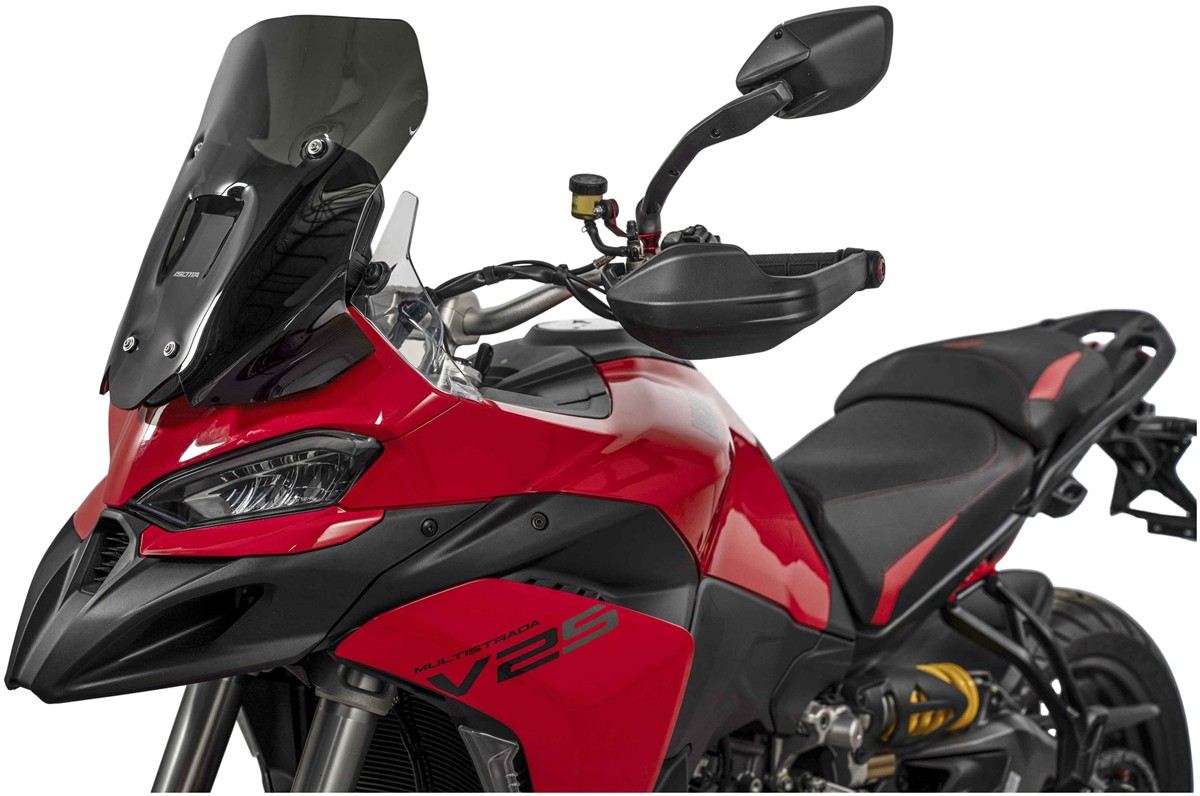 The aerodynamics peolish isotta for Ducati Multistrada V2 and V2 S 2025 is the result of a careful study aerodynamic conducted by our research and development center in Italy. Designed to improve the stability of the pilot at high speeds and optimize the air flow , this windshield reduces the aerodynamic load on the bust, increasing comfort and control also during a sports and dynamic guide. Long trips , reducing the driver's effort and improving comfort even at high speeds. The elegant and harmonious lines integrate perfectly with the front of the motorcycle, enhancing its aesthetics without weighing its profile.