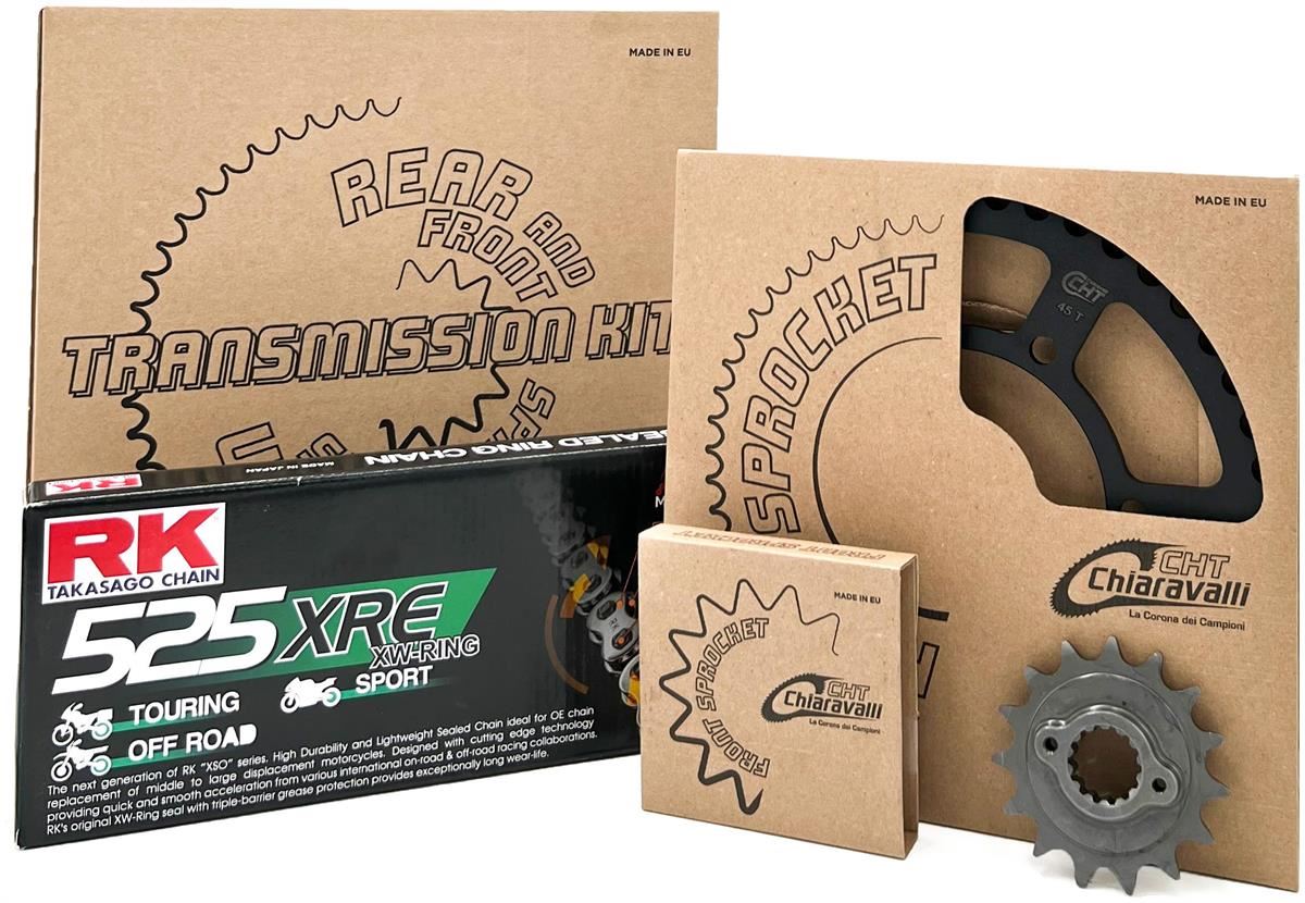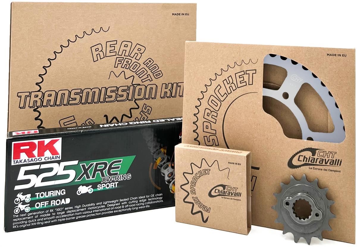 Kit consisting of RK chain and CHT Chiaravalli rear and front sprocket with ratios equal to the OEM, the type of chain supplied in the kit and the teeth of the front and rear sprockets are indicated in the product title.