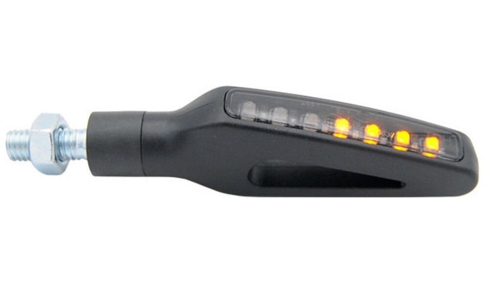 Equipped with sequential lighting, available only in black color, and designed as a universal model — although some motorcycles may require specific relays or resistors.