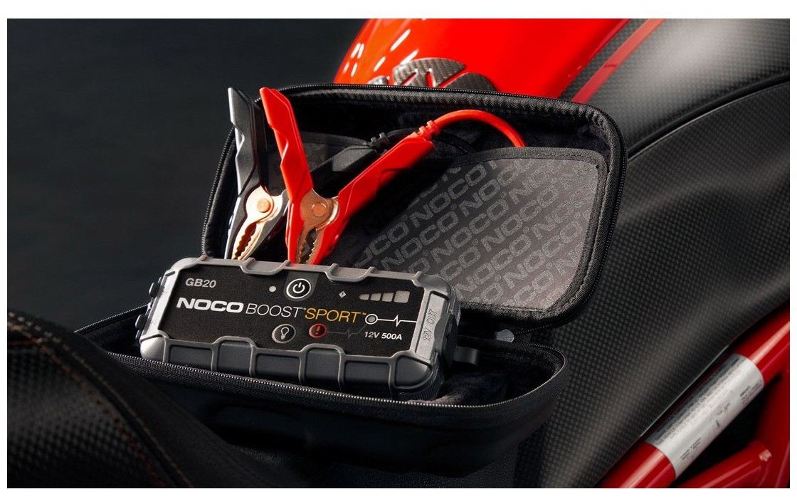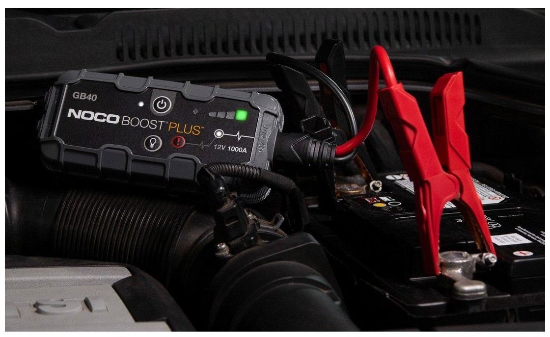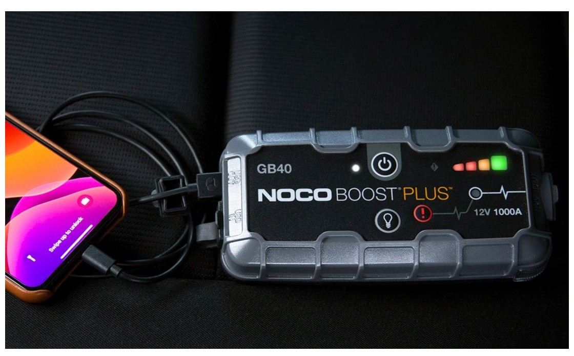 12V jump starter with 1000A peak current, capable of starting gasoline engines up to 6 liters and light diesels. Fail-safe technology prevents unwanted sparks, while the battery doubles as a power bank for smartphones and tablets. Includes LED flashlight and durable carrying case for easy transport. Item code: GB40.