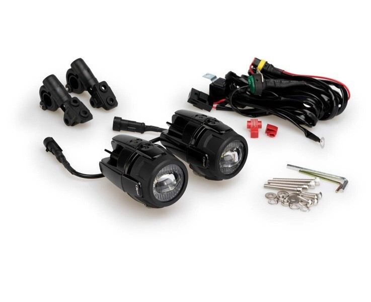 Dimensions (HXL): 110x150 mm. Diameter: 70 mm. It includes all accessories (wiring kit + switch) for the installation of engine protections between 23-25mm. For its installation in the front of the bike, check the availability. Optional metal grille for the protection of lenses for offroad use. Must be ordered separately (cod. 9785n). Equipped with fuse and wiring for direct connection to the battery and waterproof switch to install on the handlebar. Led Low Energy Consumption LED technology, avoiding to endanger the battery due to excessive consumption. Technical features: consumption: 40 W (20 for each light), voltage: DC 12V, lumen: 4000 l (2000 l for every light), material: pc lenses / aluminum protection with black finish.