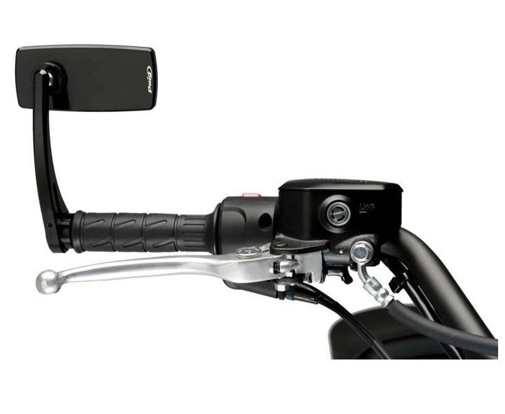 Dimensions (HXL): 45x115 mm. Material: anodized aluminum. Its fixing mechanism allows you to position the head of the product in a higher or lower position, under the handlebar. Thanks to the spherical joint behind the reflective surface it is possible to adjust the mirror while driving. The look mirror is delivered with the parts necessary for the assembly on dumbbells with an internal diameter of 13 mm up to 18 mm. The same code for both sides. If you want a right and one left mirror, you must order two quantities of this code. Not approved. In motorcycle models that do not require a specific adapter it is necessary to remove the internal mechanism of fixing the original barbell. Not compatible with the rocker and brake lever/clutch protections.