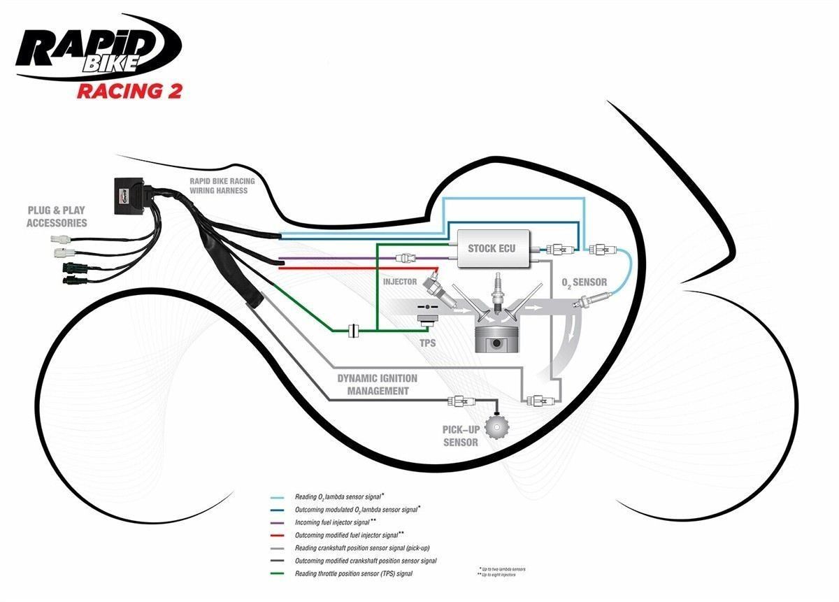 RapidBike RACING, "All-In-One Professional Racing Module": dynamic and multi-map management of oxygen sensor, self-adaptive injection, ignition (spark advance), management of limiters (even pit-lane RPM feature), engine braking control while decelerating.