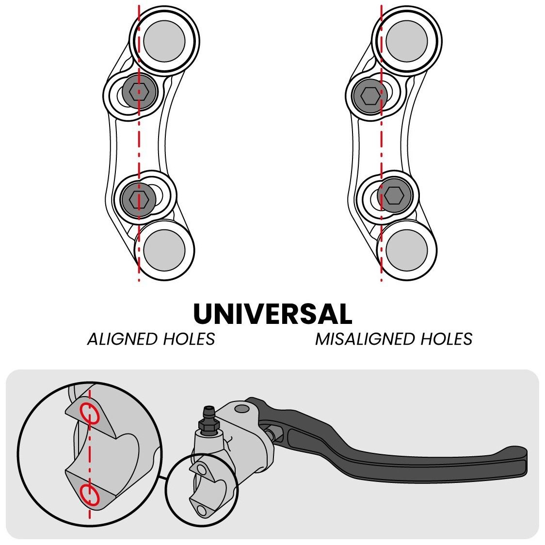 NOTE: This hand control is designed to be mounted on the brake master cylinder in place of the original cuff. It has a universal hole pattern that allows mounting on both brake master cylinders with aligned mounting holes and those with misaligned holes.