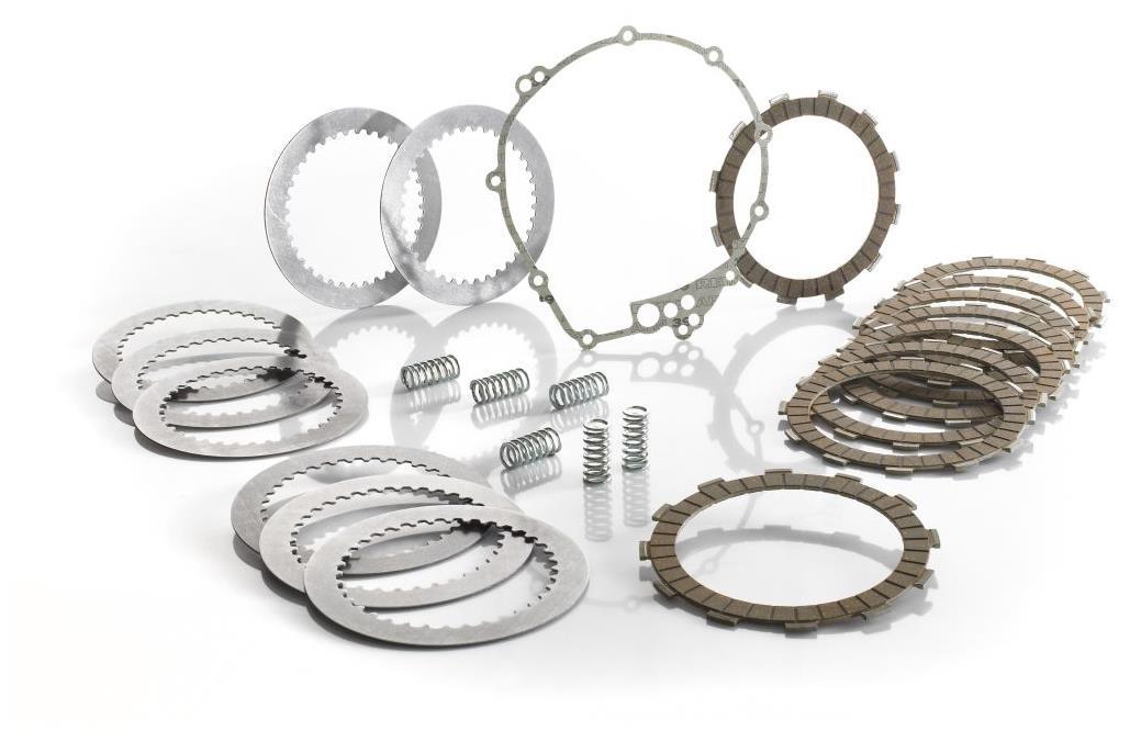 Complete clutch kits contain springs, friction, steel plates together with a clutch cover gasket