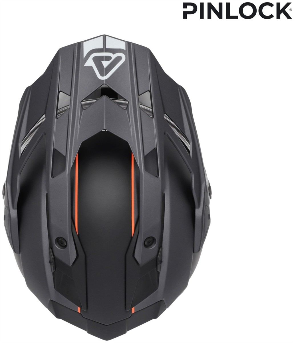 La visiera panoramica, trattata con rivestimento anti-graffio e anti-appannamento grazie anche alla possibilità di inserire il PINLOCK, offre un campo visivo ampio e chiaro, migliorando la sicurezza su strada e fuori. Il casco è inoltre dotato di interni completamente removibili e lavabili, realizzati in tessuto ipoallergenico e traspirante, per garantire un comfort duraturo anche durante le uscite più impegnative.