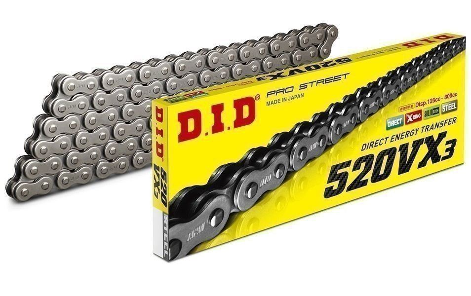 La catena DID VX3, grazie alla teconologia X-Ring che trattiene di più il grasso, garantisce una durata del 40% in più rispetto alle catene con O-Ring.