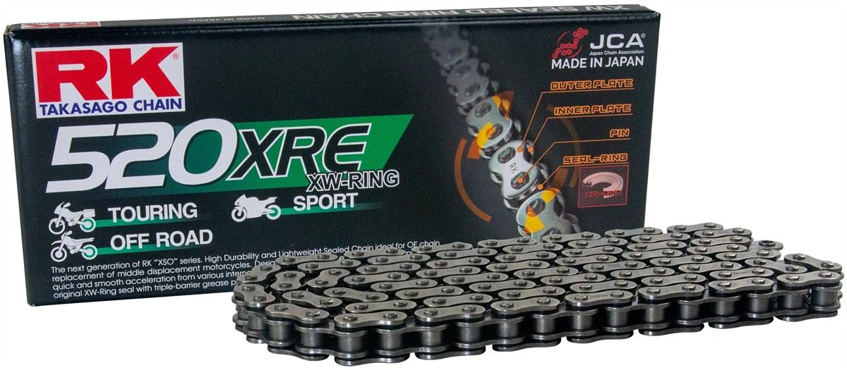 La nuova serie XRE di catene per moto RK è stata progettata per rispondere alle esigenze di potenza dei moderni modelli di moto e alla richiesta dei costruttori di ridurre le dimensioni delle catene per le moto di alta cilindrata.