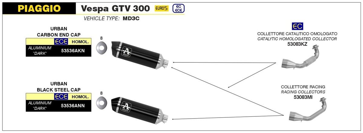 Collettori Arrow catalitico per scarico Urban omologato per Piaggio Vespa GTS 300 21-24