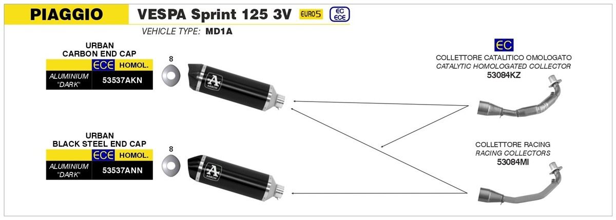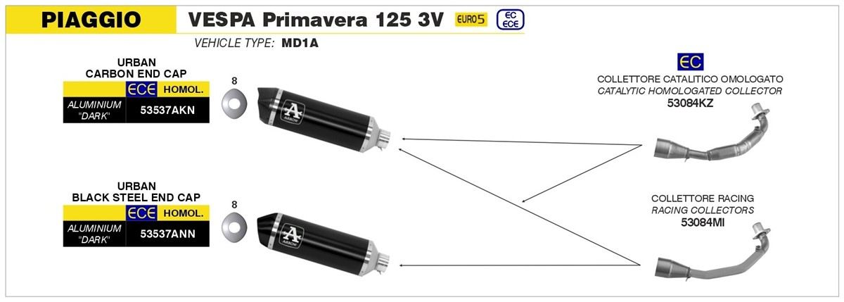 Collettori Arrow catalitico per scarico Urban omologato per Piaggio Vespa Primavera 125 ie 3V 21-22