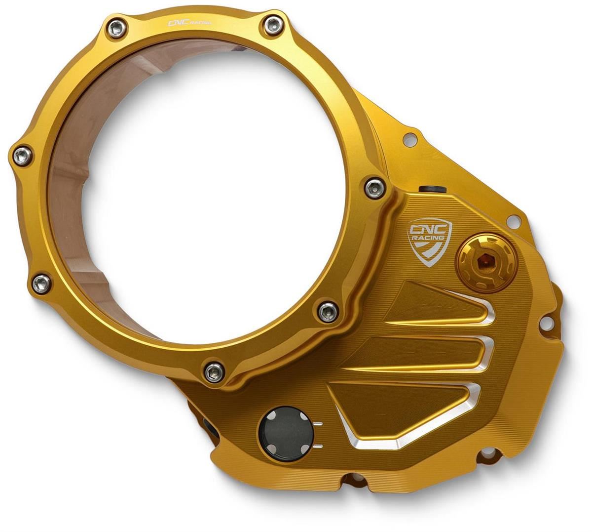 Carter trasparente per frizioni ad olio Ducati realizzato in alluminio lavorato dal pieno. La trasparenza è ottenuta con una lastra in Lexan resistente ad urti e temperature, la cui tenuta idraulica viene garantita dall'utilizzo di uno specifico o-ring.