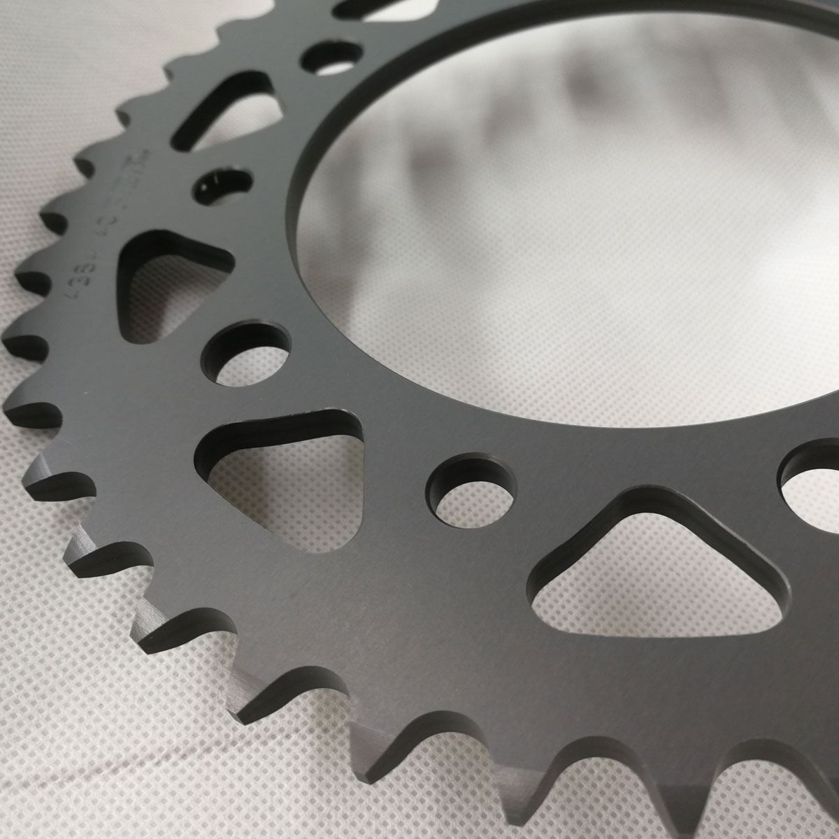 - ergal: costruite utilizzando alluminio 7075-T6 sono il massimo per chi vuole alleggerire la trasmissione e per chi vuole un accessorio veramente da intenditore. Il peso della corona in ergal rispetto all'acciaio è inferiore alla metà, mentre la sua durata è circa 2/3. Vengono fornite abitualmente in colore ergal naturale (argento) oppure su richiesta in vari colori. In alcuni casi, possono ricevere un ulteriore trattamento di anodizzazione dura che aumenta notevolmente la durezza e quindi la resistenza all'abrasione ed alla corrosione. Chiedere per conoscere i tempi di attesa e il sovraprezzo per l'anodizzatorura colorata o dura.