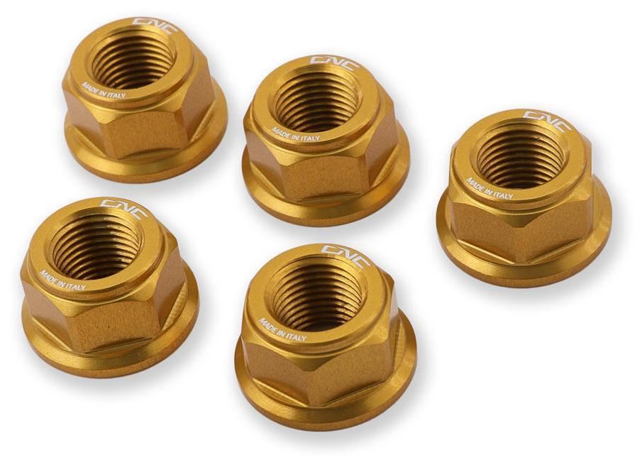 Dadi corona realizzati dal pieno in lega leggera tramite macchine CNC, e successiva anodizzazione superficiale.