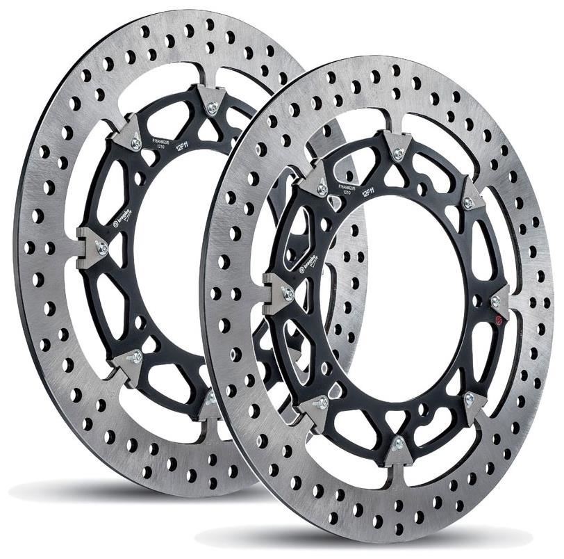 Brembo, azienda leader nel campo degli impianti frenanti, offre con i dischi T-DRIVE sono intercambiabili agli originali e adatti a lavorare sia con le pinze di serie che con le BREMBO Racing. Nato dall’esperienza maturata in SBK e MotoGP, il disco “T-Drive” presenta un nuovo accoppiamento tra fascia e campana, costituito da otto perni a “T” ricavati sul disco e da otto sagome sulla campana, che consente l’eliminazione dei nottolini di trascinamento. Questo sistema garantisce la trasmissione della coppia frenante in modo più efficace e migliora la resistenza agli stress termomeccanici. Il sistema “T-DRIVE” permette la flottanza sia radiale sia assiale e consente di ridurre il peso complessivo del disco, portando un consistente vantaggio nella guidabilità. La fascia è stata ottimizzata sia riducendone l’altezza (più leggerezza) sia ridistribuendo la disposizione dei fori (di diametro differenziato). Anche la campana contribuisce in maniera sostanziale al risultato finale: realizzata in lega leggera tramite lavorazioni CNC, è stata progettata per garantire leggerezza e rigidità.