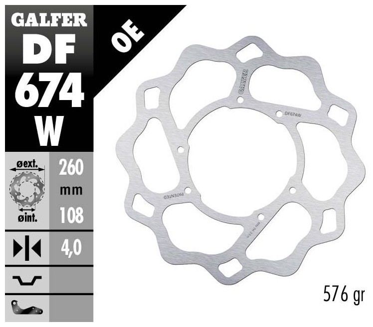 I dischi “Disc Wave®” rappresentano l’esempio migliore di Ricerca e Sviluppo di Galfer. I dischi Galfer vengono prodotti con macchine a taglio laser utilizzando la miglior qualità di acciaio inossidabile. Le tecnologie di produzione derivano direttamente dalle competizioni e rese disponibili a tutti gli utenti. Il montaggio non richiede staffe o parti supplementari e sono compatibili ai ricambi originali. Il disco freno “Disc Wave®” è una proprietà intellettuale di Industrias Galfer SA protetta da brevetto in Europa ed America.