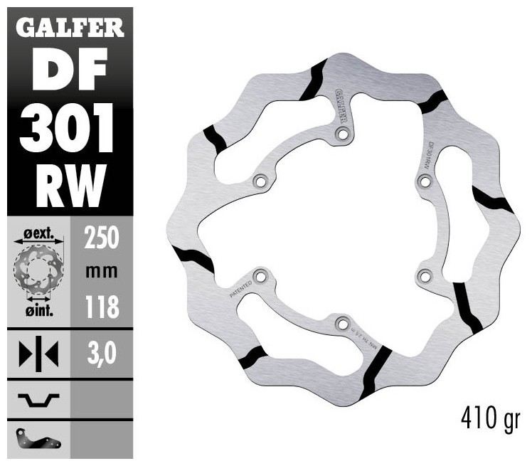 I dischi “Disc Wave®” rappresentano l’esempio migliore di Ricerca e Sviluppo di Galfer. I dischi Galfer vengono prodotti con macchine a taglio laser utilizzando la miglior qualità di acciaio inossidabile. Le tecnologie di produzione derivano direttamente dalle competizioni e rese disponibili a tutti gli utenti. Il montaggio non richiede staffe o parti supplementari e sono compatibili ai ricambi originali. Il disco freno “Disc Wave®” è una proprietà intellettuale di Industrias Galfer SA protetta da brevetto in Europa ed America.