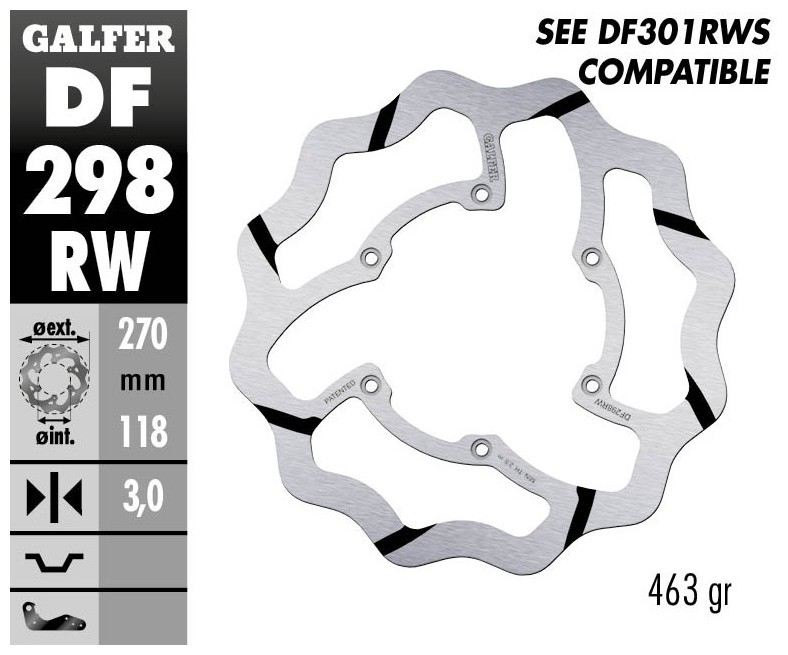 I dischi “Disc Wave®” rappresentano l’esempio migliore di Ricerca e Sviluppo di Galfer. I dischi Galfer vengono prodotti con macchine a taglio laser utilizzando la miglior qualità di acciaio inossidabile. Le tecnologie di produzione derivano direttamente dalle competizioni e rese disponibili a tutti gli utenti. Il montaggio non richiede staffe o parti supplementari e sono compatibili ai ricambi originali. Il disco freno “Disc Wave®” è una proprietà intellettuale di Industrias Galfer SA protetta da brevetto in Europa ed America.