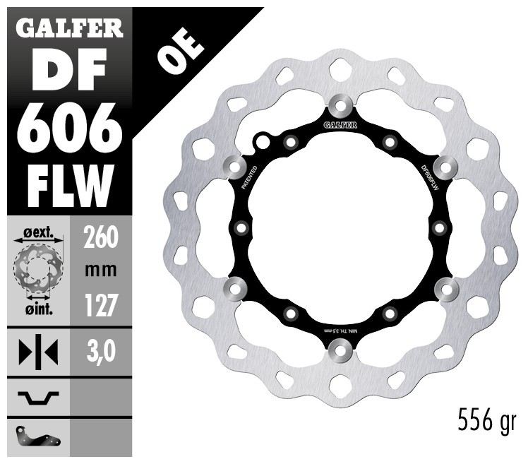 I dischi “Disc Wave®” rappresentano l’esempio migliore di Ricerca e Sviluppo di Galfer. I dischi Galfer vengono prodotti con macchine a taglio laser utilizzando la miglior qualità di acciaio inossidabile. Le tecnologie di produzione derivano direttamente dalle competizioni e rese disponibili a tutti gli utenti. Il montaggio non richiede staffe o parti supplementari e sono compatibili ai ricambi originali. Il disco freno “Disc Wave®” è una proprietà intellettuale di Industrias Galfer SA protetta da brevetto in Europa ed America.
