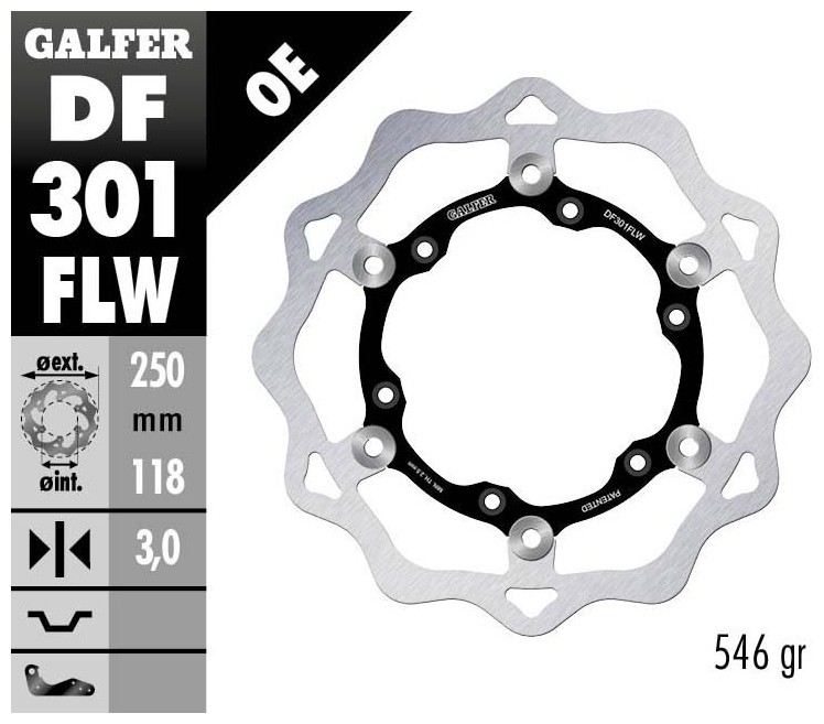 I dischi “Disc Wave®” rappresentano l’esempio migliore di Ricerca e Sviluppo di Galfer. I dischi Galfer vengono prodotti con macchine a taglio laser utilizzando la miglior qualità di acciaio inossidabile. Le tecnologie di produzione derivano direttamente dalle competizioni e rese disponibili a tutti gli utenti. Il montaggio non richiede staffe o parti supplementari e sono compatibili ai ricambi originali. Il disco freno “Disc Wave®” è una proprietà intellettuale di Industrias Galfer SA protetta da brevetto in Europa ed America.