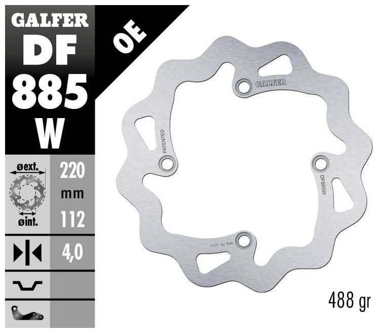 I dischi “Disc Wave®” rappresentano l’esempio migliore di Ricerca e Sviluppo di Galfer. I dischi Galfer vengono prodotti con macchine a taglio laser utilizzando la miglior qualità di acciaio inossidabile. Le tecnologie di produzione derivano direttamente dalle competizioni e rese disponibili a tutti gli utenti. Il montaggio non richiede staffe o parti supplementari e sono compatibili ai ricambi originali. Il disco freno “Disc Wave®” è una proprietà intellettuale di Industrias Galfer SA protetta da brevetto in Europa ed America.
