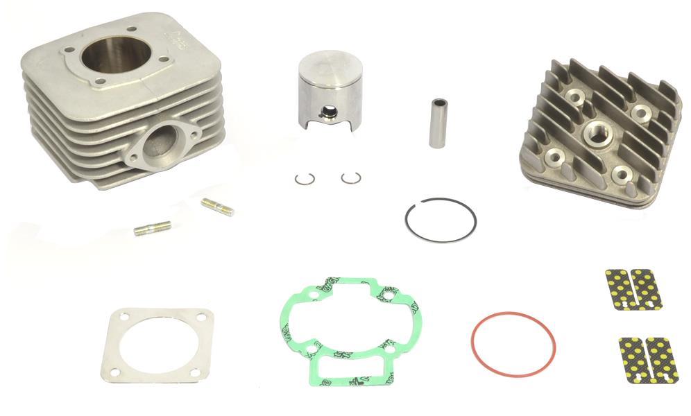 Il kit comprende il cilindro in alluminio di alta qualità, il pistone completo con spinotto pistone e anellini, e le guarnizioni necessarie.