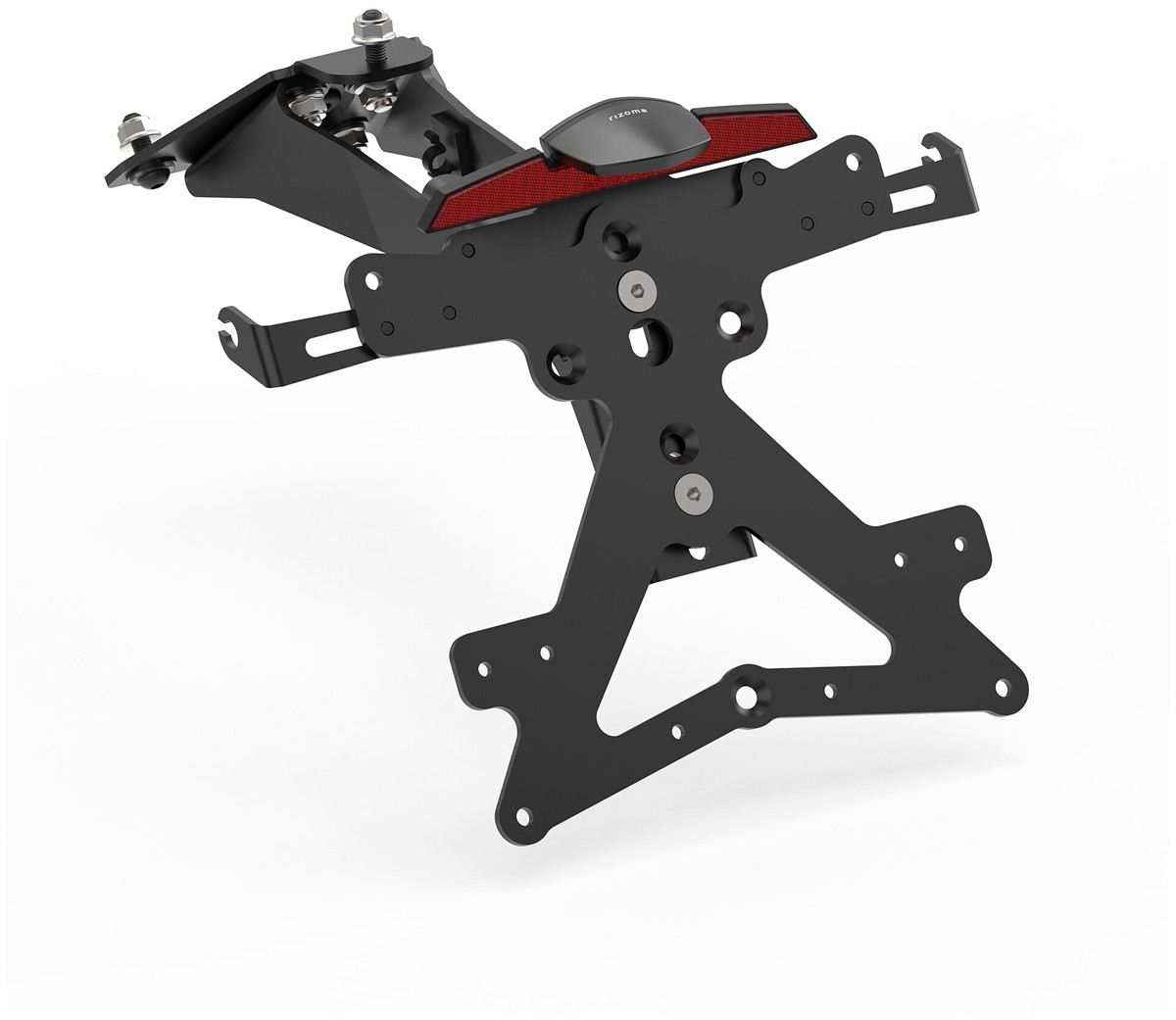 Kit completo di piatto targa 173x173 mm, piatto targa USA 166x89,5 mm, luce targa LED SMD (omologata), supporti per indicatori di direzione Rizoma e catarifrangente.