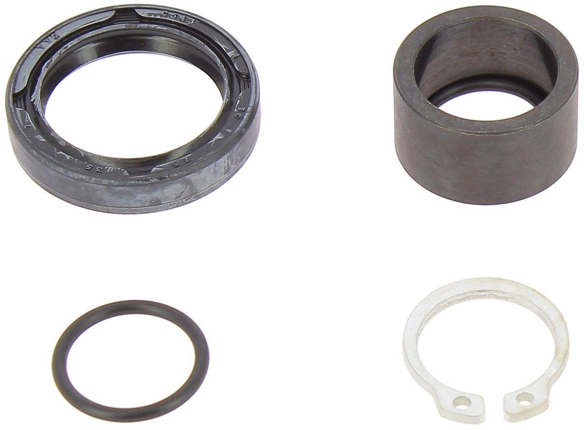Questo kit contiene il paraolio, la bussola in acciaio, l’eventuale ranella di bloccaggio ed o-ring posti a tenuta dell’olio sull’albero del cambio, dietro il pignone.