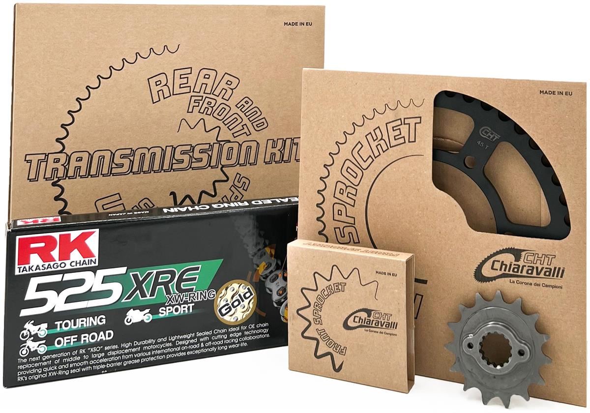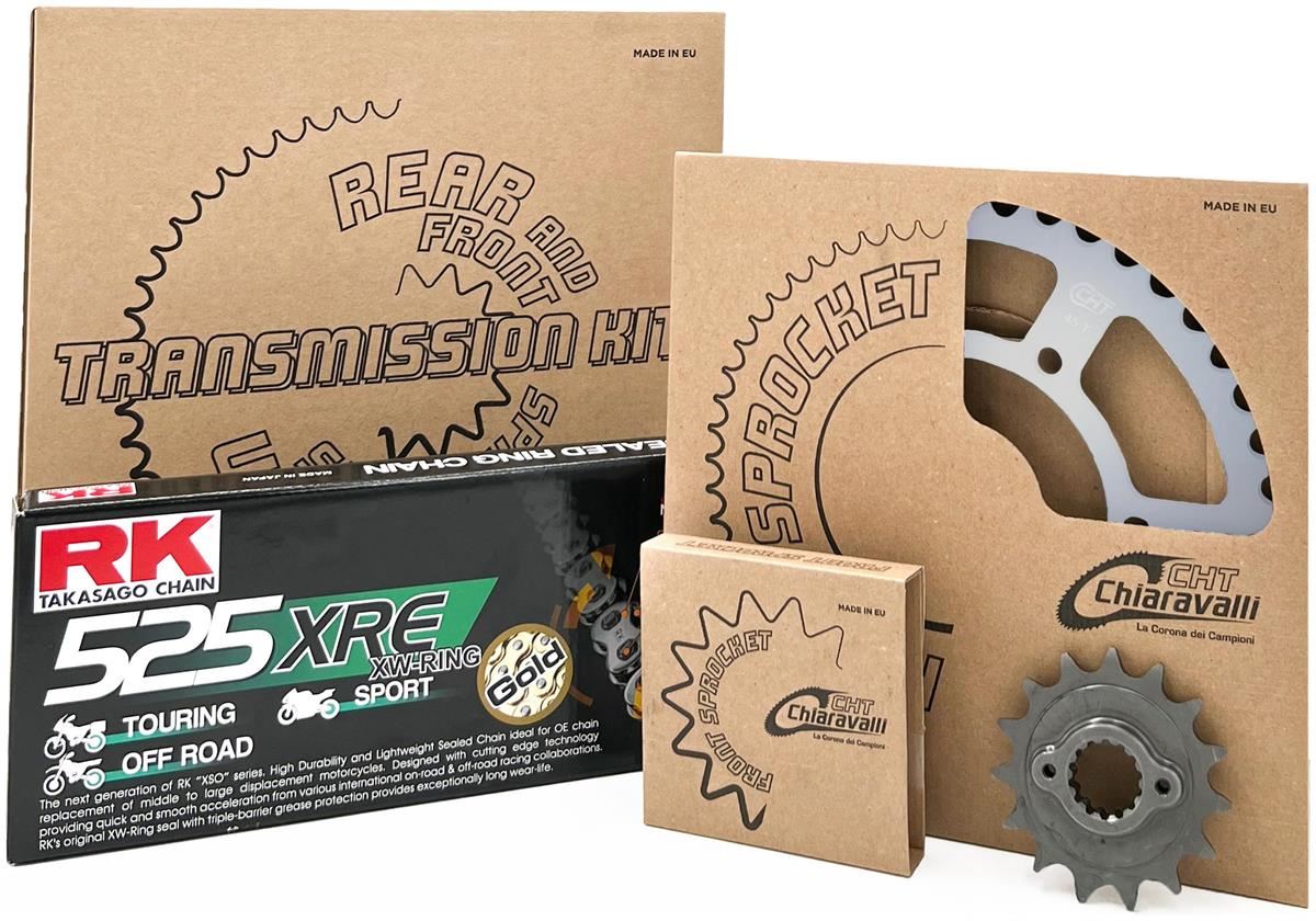 Kit composto da catena RK e corona e pignone CHT Chiaravalli con rapportatura uguale a quella originale della moto, nel titolo del prodotto sono indicati la tipologia di catena fornita nel kit e le dentature di corona e pignone.