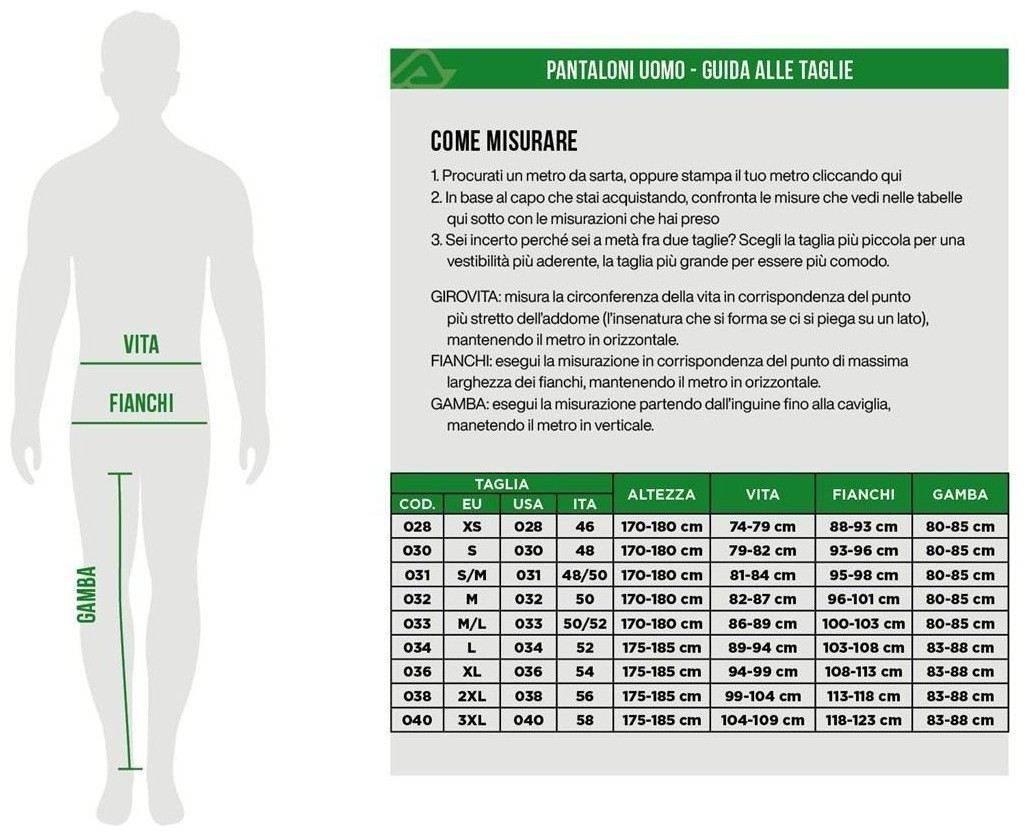 - Esterno: poliestere 600D alta densità elasticizzato sopra il ginocchio; poliestere 1200D sotto il ginocchio