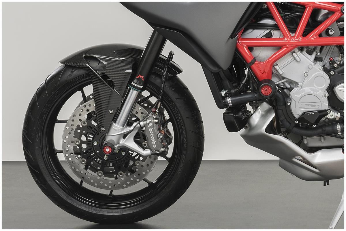 Parafango anteriore in carbonio 100%, realizzato in autoclave con l'utilizzo esclusivo di fibre di carbonio. Verniciato a mano con finitura lucida.