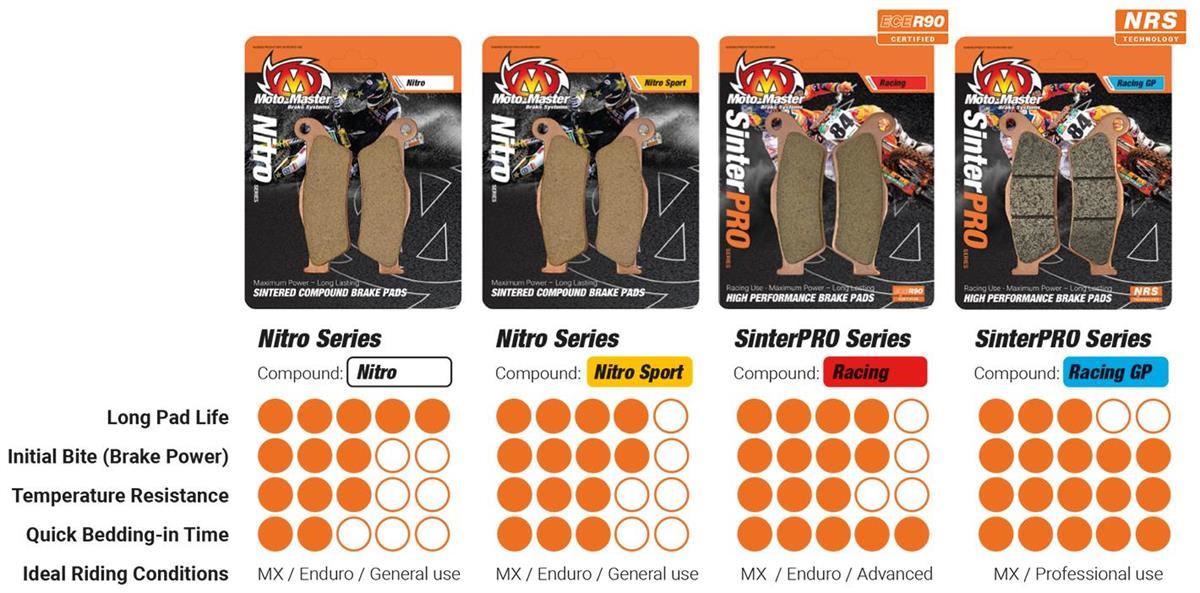 Tipo di Mescola NITRO: Le pastiglie freno Moto Master Nitro sono le pastiglie freno sinterizzate MX/Enduro per uso generale con prestazioni eccellenti per tutte le condizioni meteo. Sono inoltre adatte per l’Enduro.