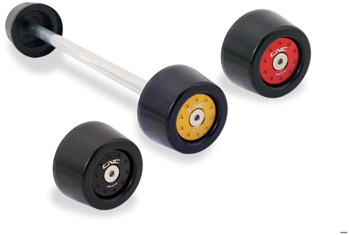 Tamponi ruota realizzati dal pieno in materiale plastico e lega leggera. Proteggono le forcelle e forcellone da accidentali cadute o scivolate e conferiscono alla moto un design più sportivo.