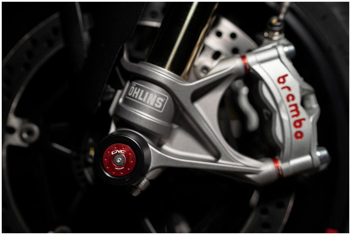 Tamponi ruota realizzati dal pieno in materiale plastico e lega leggera. Proteggono le forcelle e forcellone da accidentali cadute o scivolate e conferiscono alla moto un design più sportivo.