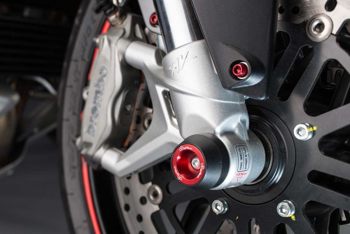 Kit di protezioni per forcella anteriore e forcellone posteriore. Nascono con lo scopo di proteggere, in caso di caduta, la forcella anteriore salvaguardando anche il piedino della forcella e le pinze freno ed il forcellone posteriore, il tutto coniugato da un design all'avanguardia che avvalora l'estetica della moto.