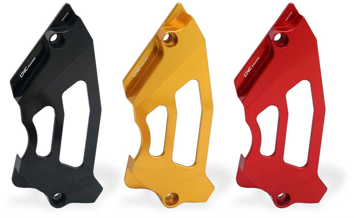 Cover pignone realizzato dal pieno in lega leggera tramite macchine CNC, e successiva anodizzazione superficiale. Sostituisce l'originale in plastica donando un estetica racing e preziosa. Non necessitano modifiche per il montaggio.