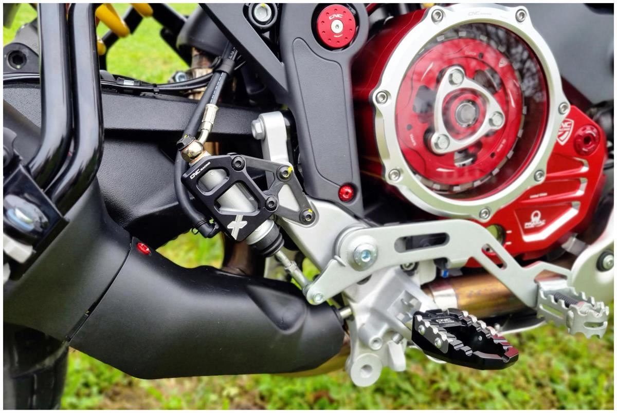 Protezione pompa freno posteriore per la Ducati DesertX lavorato dal pieno in lega leggera con successiva anodizzazione superficiale.