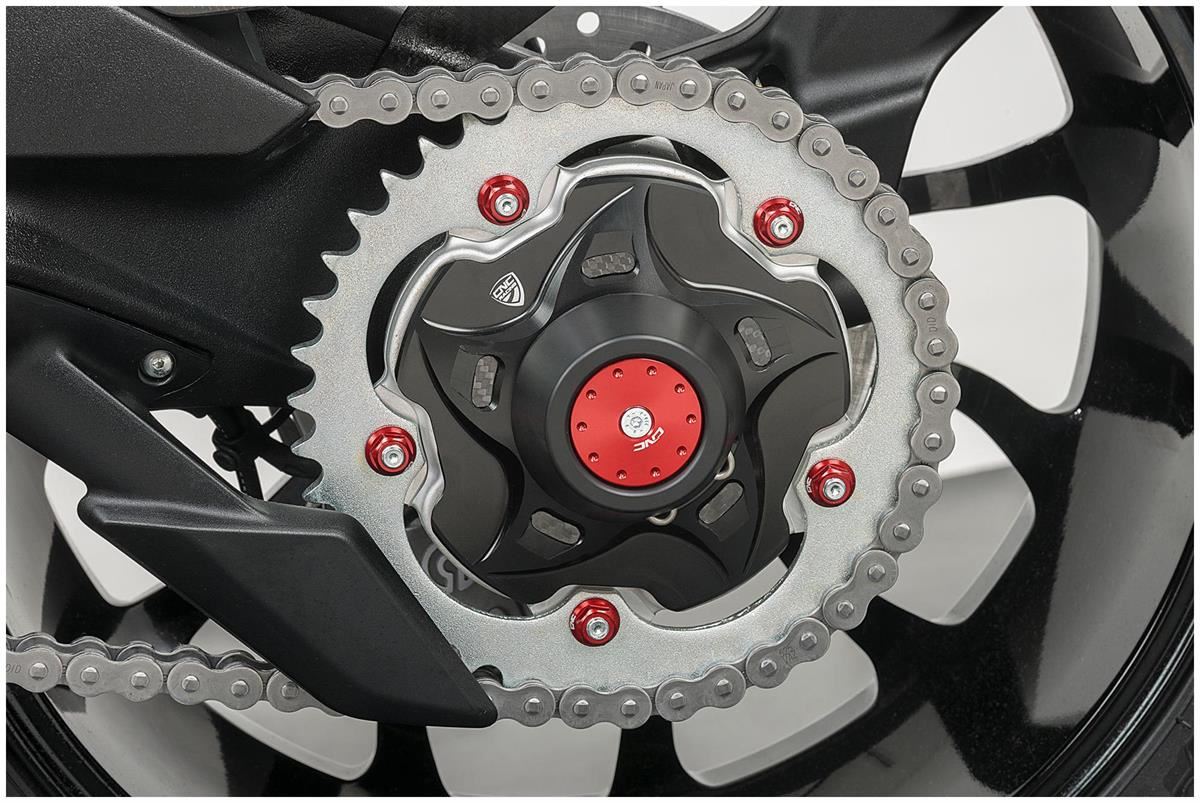 Tamponi ruota realizzati dal pieno in materiale plastico e lega leggera. Proteggono le forcelle e forcellone da accidentali cadute o scivolate e conferiscono alla moto un design più sportivo.